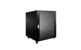 Rack high tech 19" da 12 unità, dimensioni 600x600x636 mm (L, P, H senza ruote)con ruote da 50 mm, porta frontale in vetro temperato con chiave, porta posteriore e laterali in acciaio rimovibili, montanti interni in acciaio da 2 mm frontali e posteriori regolabili in profondità. Lamiera esterna da 1.2 mm con verniciato a polveri colore Nero RAL 9004. Entrata cavi dal basso e dall'alto e griglia ventilazione nel coperchio. Conforme a standard ANSi/EIA RS-310D, DIN41491 e IEC60297. Portata fino a 800 Kg statici. Peso 39 Kg.