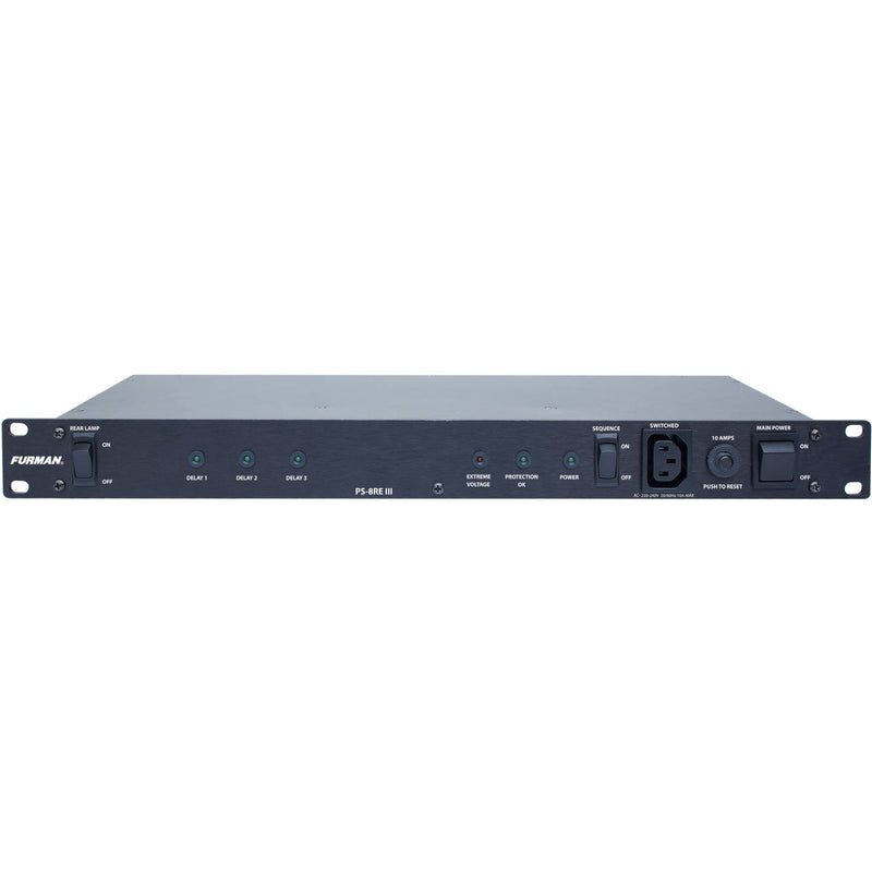 Distributore \ Condizionatore \ Sequencer di rete 230VAC con 9 prese IEC di cui una frontale ( senza temp.) e 8 posteriori di cui 2 senza temp.e 6 divise in 3 gruppi di 2 temporizzate a tempi diversi; 1 unità rack; interruttore generale frontale; interruttore e pulsante avvio sequenza; 3 Led avvisamento sequenza in atto; morsetti euroblock posteriori per remotare la temporizzazione;Led (verde)frontale di segnalazione protezione apparecchi inserita e Led (rosso) di segnalazione extravoltaggio; entrata a cavo alim.posteriore; breacker 10A anteriore; connettore BNC posteriore per inserire lamp.illuminaz.post.del rack con interruttore accens.frontale; include: Filtro brevettato anti RF ed interferenze elettromagnetiche ( LiFT ); Sistema di protezione brev.(SMP) dai picchi di tensione ( 376Volts ) / corrente ( 3.000Amp.); sistema di eliminazione dei picchi di tensione (E.V.S.); assenza assoluta di contaminazione verso massa; max.potenza in transito 10A a 230VAC, misure: 44x483x265mm, peso 5Kg, col.nero