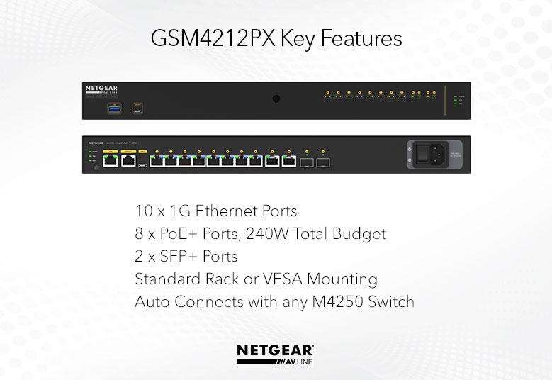 M4250-10G2XF-POE+ fa parte della linea M4250 Switches Layer 3 specificatamente progettata per essere utilizzata sia per gestione dati che per AV. Supporto AVB Incluso. Led di stato duplicati sia su fronte che retro, 1U Rack, 8 Porte RJ-45 1Gbps POE+ con budget da 240W, 2 porte RJ-45 1Gbps, 2 Porte SFP+ Uplink da 1/10 Gbps e porte console RJ45, RS232 e USB-C.