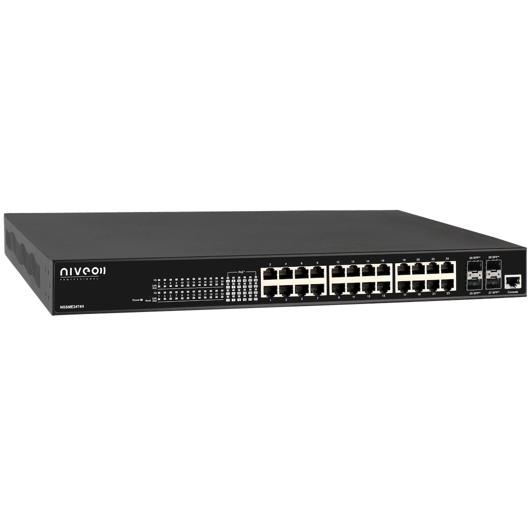 Switch completamente gestito L2/L3 24-porte 10/100/1000 PoE+ 802.3at (budget 520W) con 4 porte in condivisione TP/SFP+ (10G) non popolate. Supporto VLAN 802.1Q, Spanning tree (RSTP e MSTP), Link aggregation (Static Trunk & IEEE 802.3ad con LACP), IGMP snooping e QoS. Non blocking con supporto jumbo frame. Gestione da Web GUI e CLI (Telnet). Connessioni sicure HTTPS e SSH. Alimentazione 100-240Vac. Dimens. WxDxH 440 x 330 44 mm, peso 3Kg.