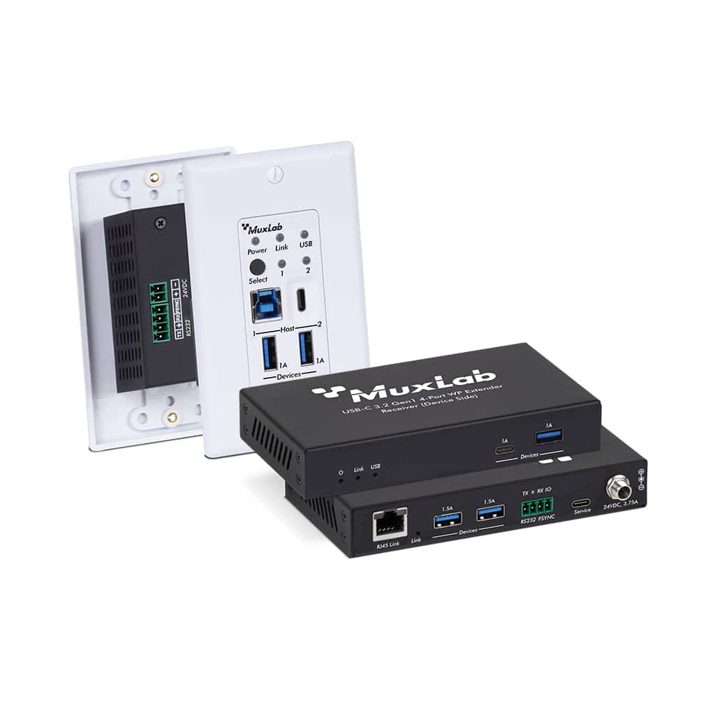 Kit extender USB 3.2 Gen1 4 porte Wall Panel, 100m. Permette di estendere USB 3.2 Gen1 dall'host ai device fino a 100m tramite cavo CAT6A. Data transfer fino a 5Gbps. Retrocompatibile con USB 2.0 e USB 1.1. 3 porte USB type A e una porta USB type C lato ricevitore per la connessione fino a 4 device. 1 porta USB type C e 1 porta USB type B lato trasmettitore per la connessione dell'host USB. 2 porte USB type A lato trasmettitore per la connessione di 2 device. Possibilità di alimentazione dal trasmettitore, oppure dal ricevitore tramite singolo alimentatore 24VDC/2A incluso, uno dei dispositivi viene alimentato tramite PoC. Cavi USB non inclusi. TX wall panel e RX a montaggio superficiale. Dimensioni TX: 45mm [W] × 42mm [D] × 103.5mm [H]. RX: 140mm [W] × 75mm [D] × 23mm [H]. Peso: Transmitter: 115g, Receiver: 318g