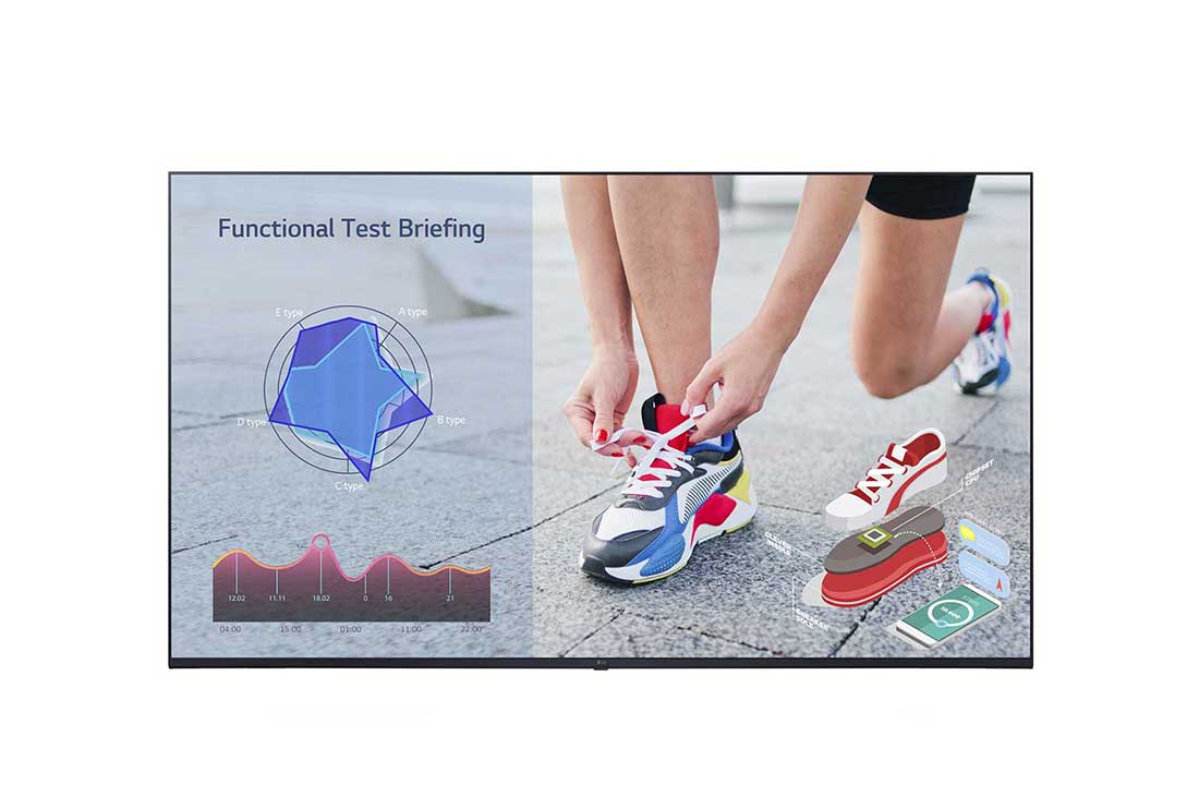 Monitor serie Signage da 65" pannello IPS Full UHD, Risoluzione 3840x2160, Luminosità 400 nit, Contrasto 1,200:1, Operatività 16/7, WiFi integrato, Supersign, Smart webOS / SoC Quadcore, Speaker integrati, Connessioni 3 HDMI / RS232C / RJ45 / Pixel Sensor / USB / IR / Audio, Dimensioni: 1.463 × 850 × 87,8 mm; Installazione Verticale / Orizzontale, Vesa 300 x 300, Peso 21,3 Kg, colore nero.