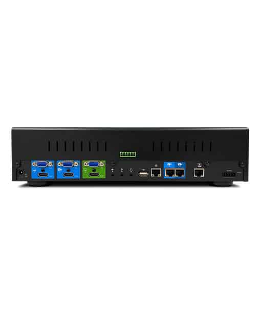 Media station con touch panel da 10" per la registrazione sincronizzata fino a 3 sorgenti Full-HD. Dispone di 2 ingressi HDMI/VGA e 2 porte RJ45 per telecamere IP (portocolli compatibili RTSP, RTP, RTMP). Disco interno da 1 TB (HD 2.5" SATA). Compatibilità con Storage USB e NAS. Live streaming su due piattaforme in contemporanea (YouTube, Facebook, e altre) oppure su rete locale LAN (formati streaming d'uscita: RTP, RTMP (RTMPS), RTSP. Interfaccia utente grafica (GUI) su display touch integrato, consente agli utenti di avviare o interrompere la registrazione / streaming, modificare i layout di registrazione. Offre anche pulsanti di controllo sulla parte anteriore della macchina. Controllabile da pagina web con Online Director. Supporto protocolli VISCA over IP/ ONVIF profile S. Layout multipli predefiniti e personalizzabili dall'utente(full screen / Picture in Picture / Picture by Picture). Ingressi audio linea, microfonico su mini jack, ingresso audio bilanciato su connettore Phoenix. Uscita video HDMI. Uscita audio su mini jack. Possibilità di backup via FTP/SFTP. Una porta WAN per internet e 2 porte LAN su RJ45 per telecamere IP. Porta RS232 su connettore phoenix. Alimentazione 12V/3A. Inclusi alimentatore 230VAC-12VDC / Connettori Phoenix a 6 pin e 5 pin. Dimensioni 354mm(L) x 188.2mm(W) x 91.4mm(H). Peso 2.65kg.