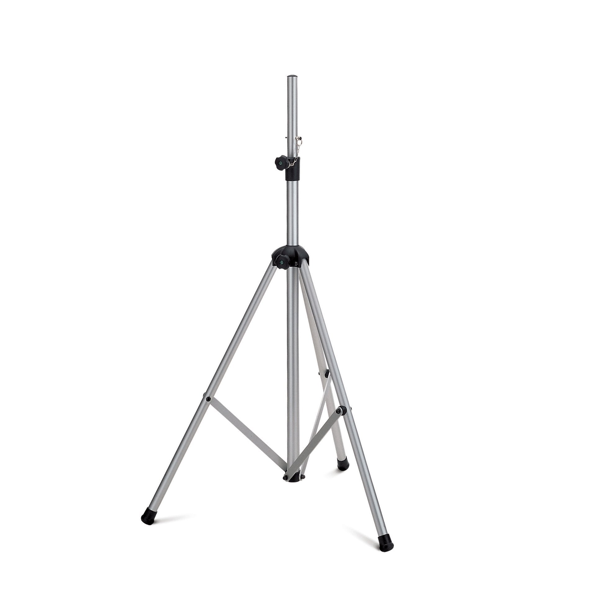 Cavalletto supporto diffusori a treppiede, telescopico con altezza regolabile da 1305 a 2250mm, struttura completamente in alluminio. Regolazione in altezza e bloccaggio di sicurezza mediante morsetto di serraggio in nylon. Massimo carico 40Kg. Colore Alluminio, Peso 3,4kg