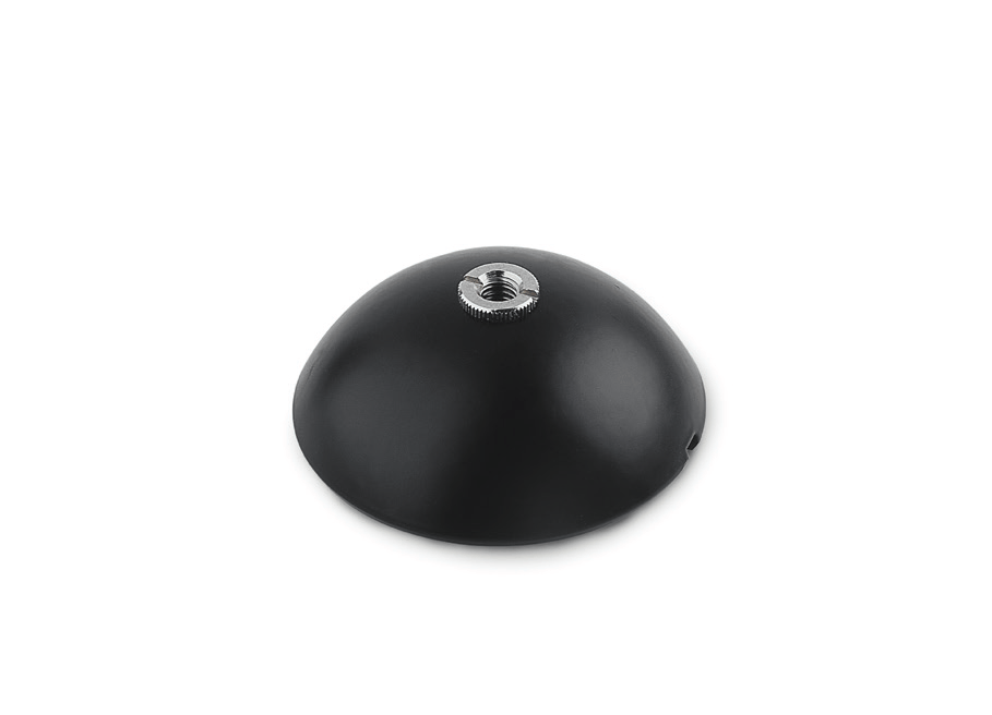 Base da tavolo rotonda in acciaio con attacco per microfoni gooseneck con filetto da 5\8" femmina e riduttore da 3\8" femmina. Diametro 93mm. Elemento antirisonante alla base. verniciatura epossidica colore nero RAL9005. Peso 1,05Kg