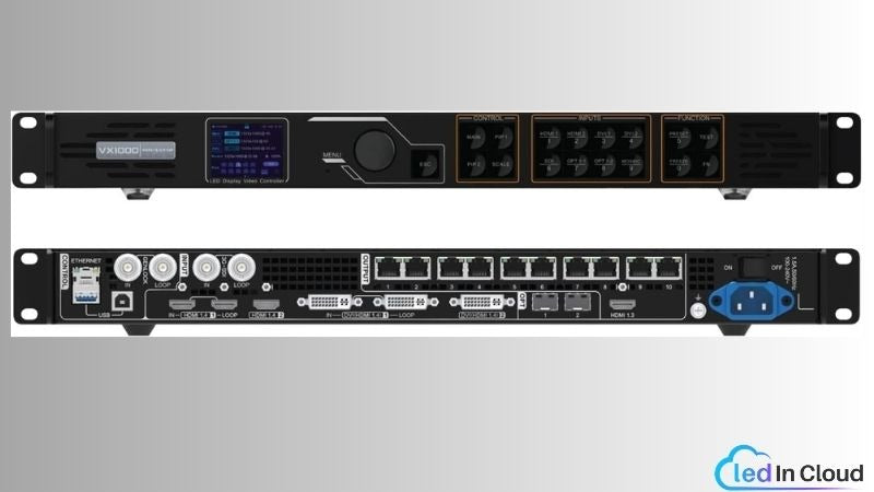 Processore e Sending Box - Capacità: 6,5 milioni di pixel - Ingressi: 1x HDMI2.0 con loop, 2x HDMI 1.3, 1x 3G-SDI con loop, 1x USB 3.0 per il playback di contenuti, 1x 3,5mm Audio Input, 1x Fiber Port (OPT1), 1x Genlock con loop - Uscite: 10 porte RJ45, 2 porte Fiber 10G (OPT1 e OPT2) (necessità moduli fiber converter Single-mode o Multi-mode), 1x HDMI 1.3 Out per monitor, 1x 3,5mm Audio Output, 1x 3D connector per uso con occhiali 3D - Controlli: 1x USB frontale, 1x USB 2.0 per aggiornamenti, 1x RS232, 2x Ethernet RJ45 - Porta per il collegamento di 1 Light Sensor - Seamless switching, 6 Layer 2K, 256 preset richiamabili da API. Configurazione schermo tramite nuovo software UNICO, free configuration. Funzione playback file Video-Grafici da USB. Controllo delle funzionalità da pannello frontale o da Software V-Can - 1 unità rack, peso 3,9Kg.