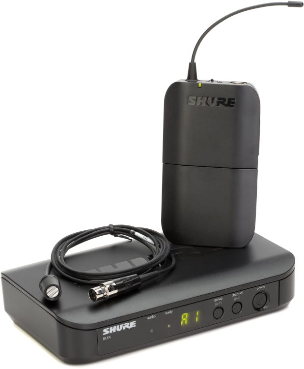 Kit radiomicrofono analogico per conferenza. Composto da un trasmettitore body-pack BLX1, un ricevitore BLX4 e un microfono Levalier CVL-B/C-TQG. Banda H8E. Accessori inclusi: alimentatore PS23E, Antivento