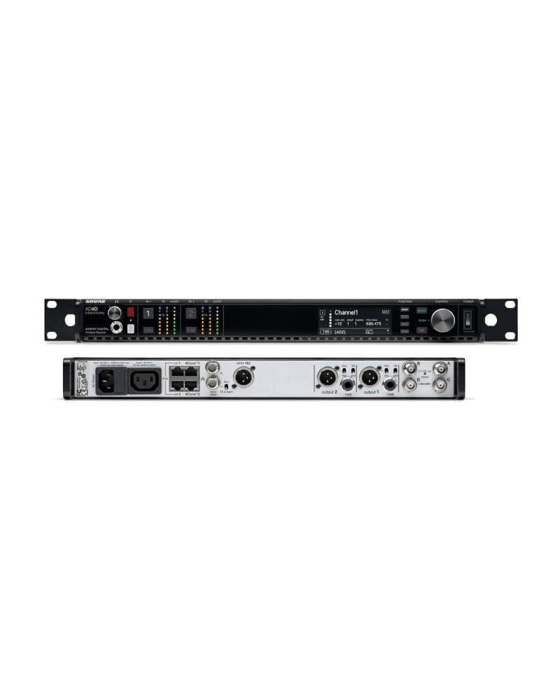 Ricevitore digitale a due canali per serie Axient Digital. Banda G56 (470 - 636 MHz). Trasmissione digitale criptata (AES-256). Fino a 22 canali contemporaneui in 8Mhz, ricerca automatica dei canali disponibili e sincronizzazione con il ricevitore tramite IR. Display LCD per visualizzare lo stato del dispositivo e i parametri di configurazione per ciascun canale. Vumeter LED con indicazioni del livello di segnale RF A e B e Audio. Pulsanti per impostazione del guadagno del sistema (range 60 dB) e SYNC. Uscita audio bilanciata XLR3 e Jack 6,3mm livello impostabile mic/line e uscita AES3-AES\EBU. Doppia porta di rete per controllo da remoto e interfaccia audio networking Dante AES67. Possibilità di configurazione "Audio Summing" e "body-pack Frequency Diversity". Uscite RF per il collegamento di altri ricevitori. Alimentazione antenna 12-13 Vdc, max 150 mA. Alimentazione: 100-240 Vac, 0,26 A max. Dimensioni: 44 mm x 482 mm x 274 mm, 1 unità rack.