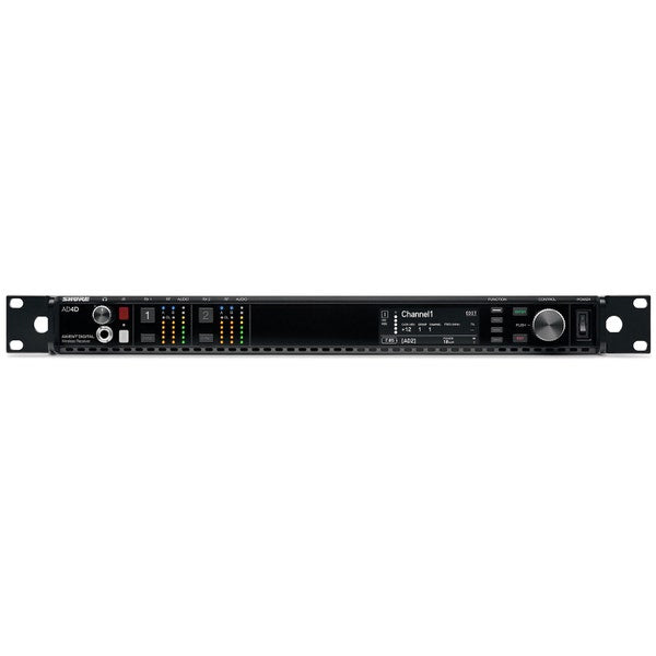 Ricevitore digitale a due canali per serie Axient Digital. Banda G56 (470 - 636 MHz). Trasmissione digitale criptata (AES-256). Fino a 22 canali contemporanei in 8Mhz, ricerca automatica dei canali disponibili e sincronizzazione con il ricevitore tramite IR. Display LCD per visualizzare lo stato del dispositivo e i parametri di configurazione per ciascun canale. Vumeter LED con indicazioni del livello di segnale RF A e B e Audio. Uscita audio bilanciata XLR3 e Jack 6,3mm livello impostabile mic/line e uscita AES3-AES\EBU. Quattro porte di rete per controllo da remoto e interfaccia audio networking Dante AES67. Possibilità di configurazione in Frequency Diversity. Uscite RF per il collegamento di altri ricevitori. Alimentazione antenna 12-13 Vdc, max 150 mA. Alimentazione: 100-240 Vac, 0,26 A max. Dimensioni: 44 mm x 482 mm x 274 mm, 1 unità rack. Senza accessori.