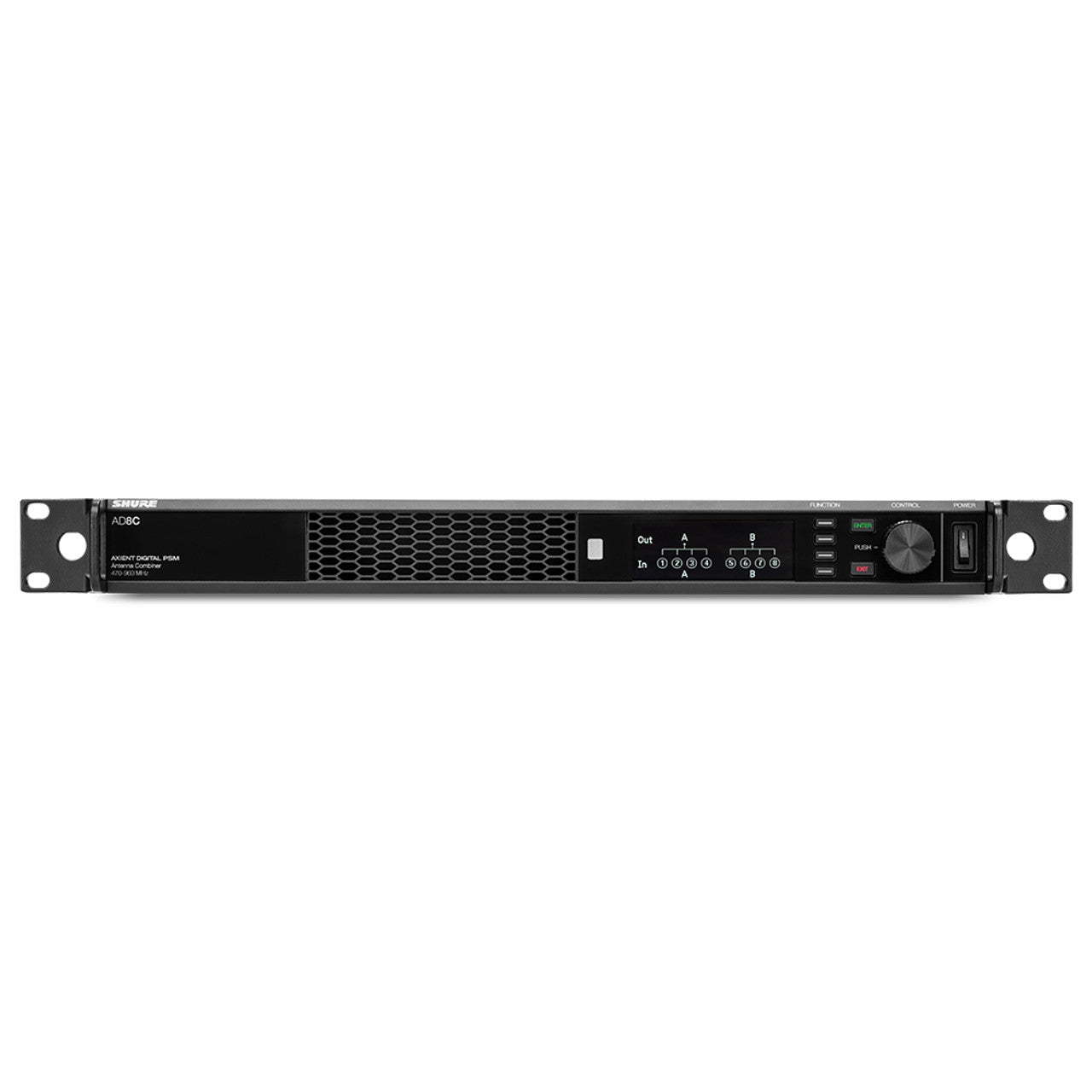 Combiner da 8 porte per la nuova serie AD PSM digitale con tecnologia WMAS. Range di frequenza 470-960MHz. Combina le uscite RF di otto trasmettitori Axient Digital PSM in una singola antenna di trasmissione. AD8C può inoltre combinare il segnale RF fino a 4 trasmettitori Axient Digital PSM per trasmetterli attraverso due antenne, supportando lo Spatial Diversity. Modalità di combining selezionabile tra 8:1 o 2X4:1. 8:1 combina fino a 32 canali WMAS oppure in modalità 2X4:1 combina fino a 16 canali WMAS. Compensazione automatica quando utilizzato con i trasmettitori ADTQ o ADTD Axient Digital PSM. Connessioni Ethernet switch per controllo remoto e update firmware. Connessioni posteriori RF con connettori BNC a 50 Ohm di impedenza. Alimentazione con connettore DC per ridondanza. Dimensioni : 1UR da 19". Alimentazione 220V.Colore nero.