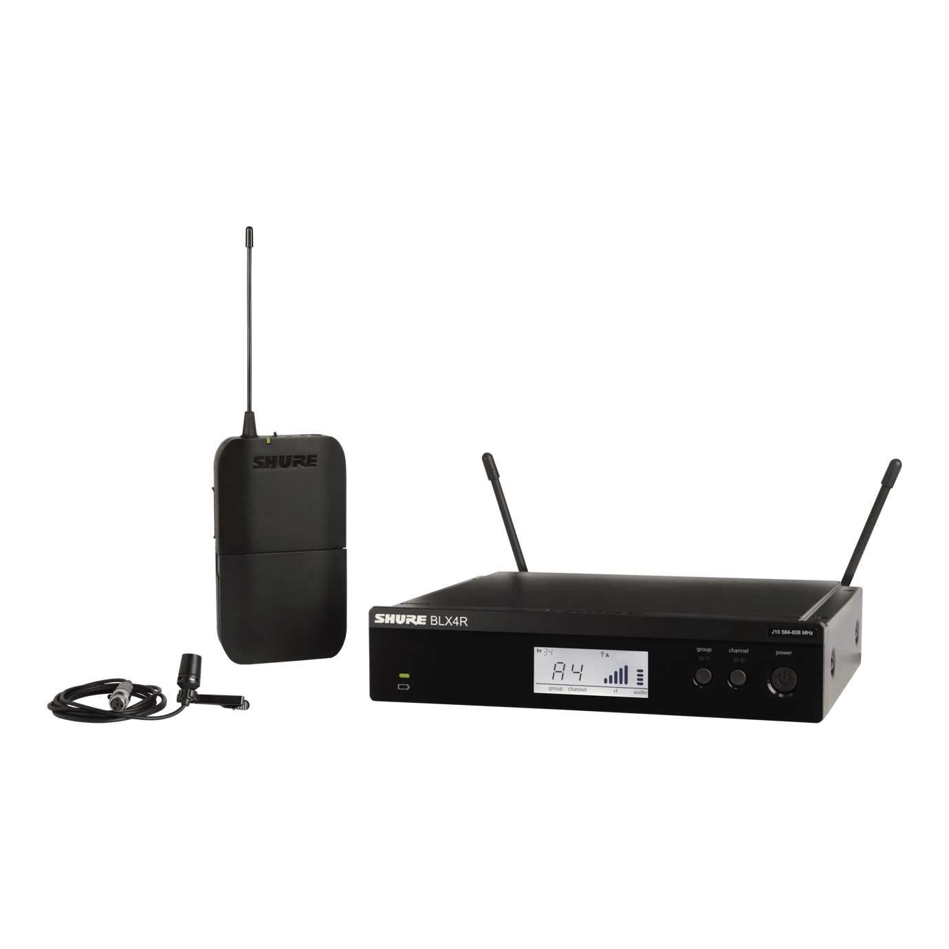 Kit radiomicrofono analogico per conferenza. Composto da un trasmettitore body-pack BLX1, un ricevitore BLX4R con accessori montaggio a rack e un microfono Levalier CVLTQG. Banda K14. Accessori inclusi: alimentatore PS23E, Antivento