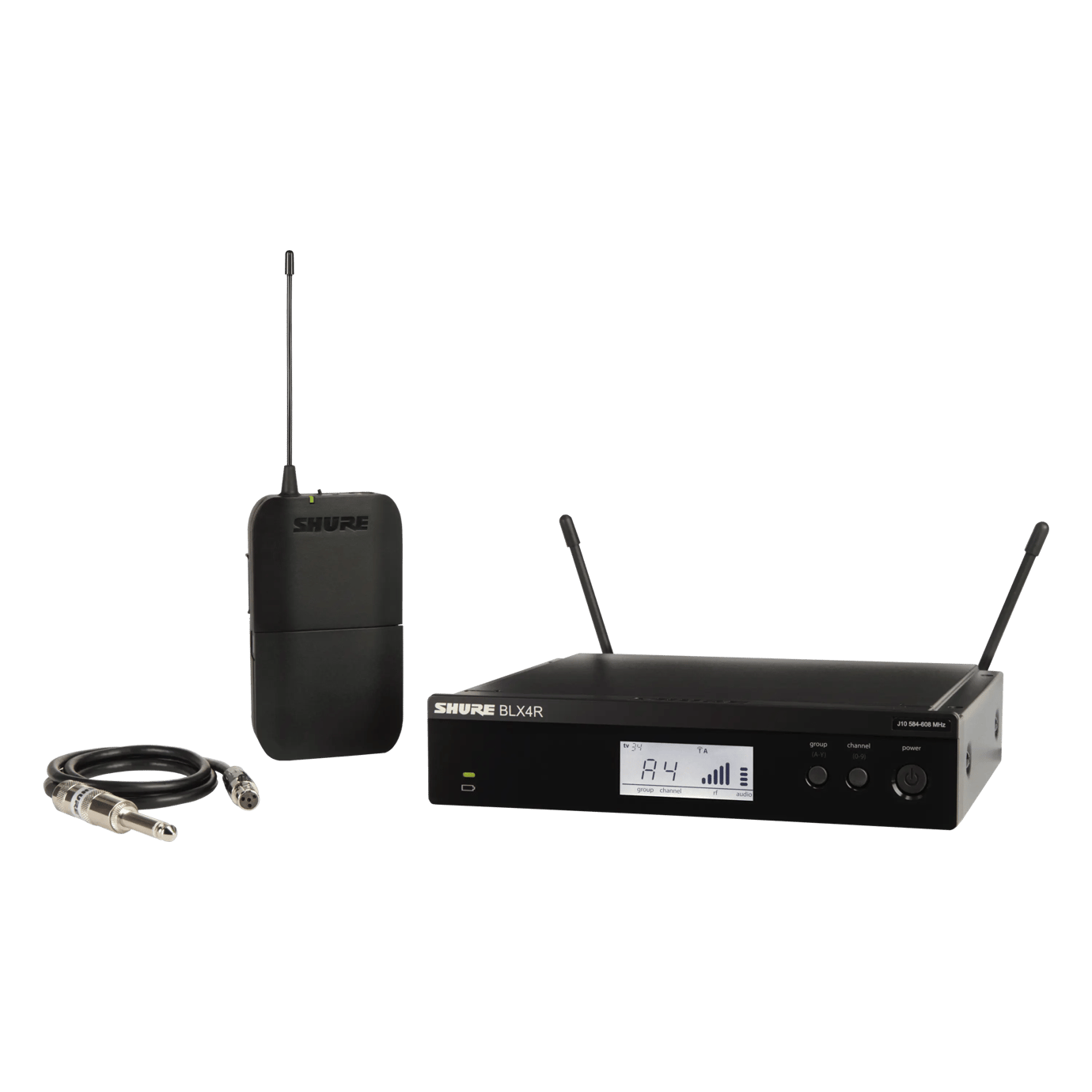 Kit radiomicrofono analogico per chitarra/basso. Banda H8E ( 518-542Mhz)Composto da un trasmettitore body-pack BLX1, un ricevitore per istallazione a rack BLX4R e cavo per strumenti WA302. Banda M17 (662 - 686 MHz). Accessori inclusi: alimentatore PS23E, supporto per asta e adattatore filettato 5/8" - 3/8", accessori per installazione a rack, kit di viti e rondelle, n°2 antenne, n°2 connettori BNC da pannello, n°2 cavi collegamento antenne 55 cm, custodia protettiva