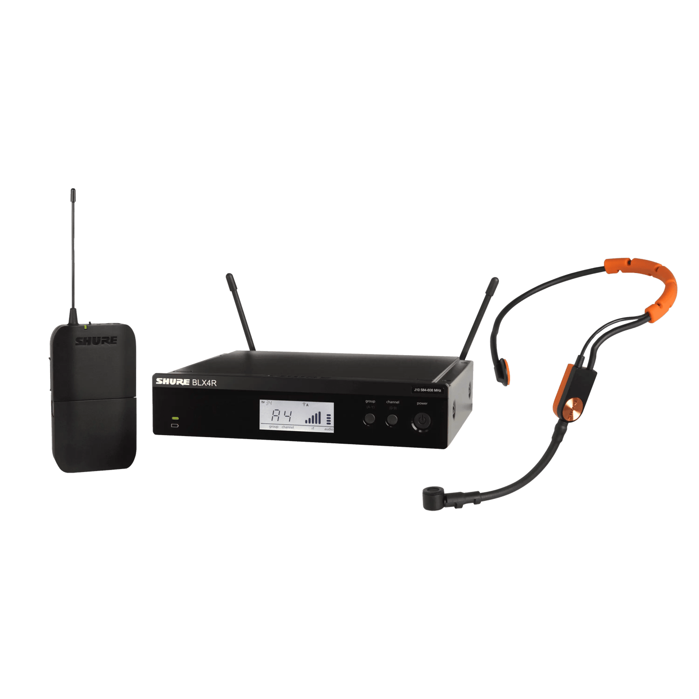 Kit radiomicrofono analogico per voce. Composto da un trasmettitore body pack BLX1 con microfono Headset SM31-TQG e un ricevitore BLX4R con accessori per montaggio a rack. Banda M17 (662 - 686 MHz). Accessori inclusi: alimentatore PS23E, valigetta per trasporto