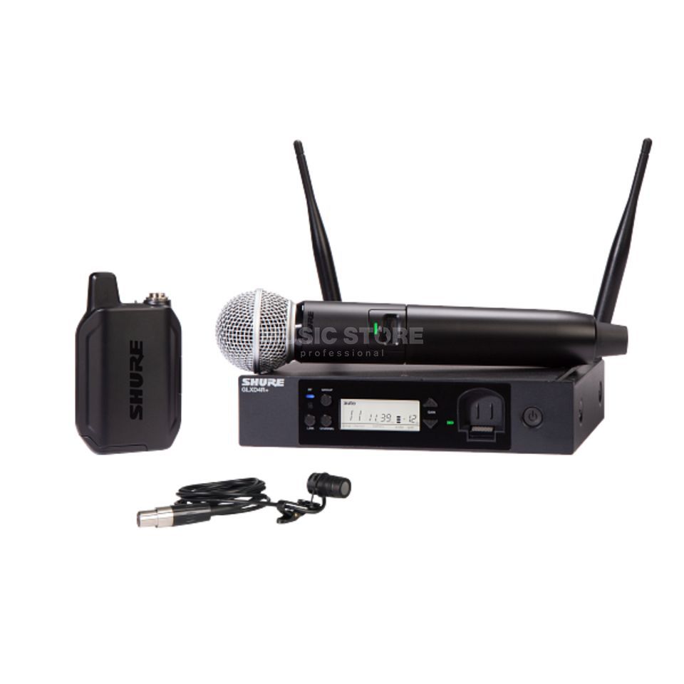 Kit con ricevitore rackabile GLXD4R+ e trasmettitore bodypack GLXD1+ con microfono Levalier Professionale WL185, viene incluso anche un microfono a mano SM58, banda Z4