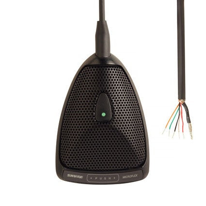 Microfono boundary con interruttore per montaggio superficiale adatto per conferenze, leggii, palcoscenici con uscita cavo a 90°. Capsula: Condensatore (Electret); Polare: Supercardioide; Risposta: 50-17000 Hz; Sens.: -28 dBV/Pa* a 1kHz *1 Pa=94 dB SPL; Impedenza: 150 Ohm; Max SPL: 118 dB; Rumore: 21 dBA; S/N: 72 dB (IEC 651) at 94 dB SPL; Interruttore a membrana con attenuazione 50 dB e LED di indicazione. Dip switch interno per scelta modalità di funzionamento e contatti logici in/out per controllo da remoto. Alimentazione: Phantom 11-52V 2mA; Dimensioni: Lunghezza 108mm Larghezza 76 mm Altezza 22mm; Colore: Nero; Cavo 3.7m non terminato. Preamplificatore integrato. Schermatura RF. Accessori inclusi: custodia morbida con zip, protezioni per pittura.