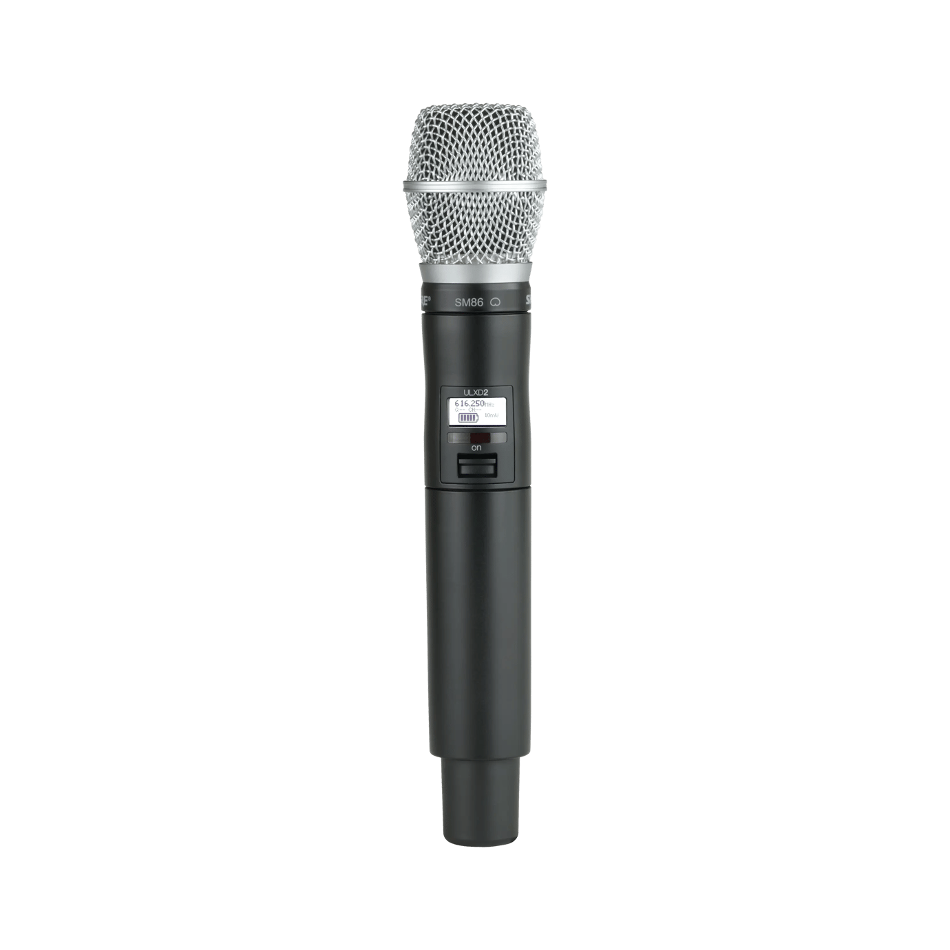 Trasmettitore digitale a mano condensatore cardioide con capsula SM 86 per serie QLX-D. Banda G51 (470 - 534 MHz). Trasmissione digitale criptata (AES-256). Potenza di trasmissione selezionabile 1-10 mW. Fino a 60 sistemi per banda, ricerca automatica dei canali disponibili e sincronizzazione con il ricevitore tramite IR. Portata max.100mt. Risposta: 20-20KHz. Dinamica: 120dB. Guadagno regolabile tra 0 - 21 dB (step 3 dB), SPL massimo 145 DB. Robusto chassis in Duralluminio, antenna elicoidale integrata. Porta IR per la sincronizzazione con il ricevitore, display LCD retroilluminato per impostazioni e monitoraggio dello stato. Alimentazione due batterie AA o batteria al litio ricaricabile Shure SB900, durata fino a 10 ore con batterie ricaricabili e 9 ore con AA. Contatti posteriori esterni per ricarica. Dimensioni: lunghezza 256 mm, diametro 51 mm. Peso: 347gr. (senza batterie) Colore Nero.