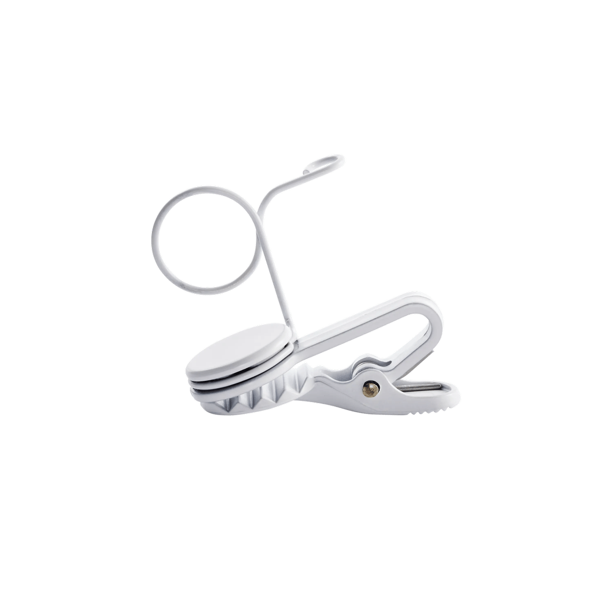 Innovativa clip da cravatta per capsula singola, capace di ruotare a step di 90° per un preciso posizionamento del lavalier. Colore bianco.