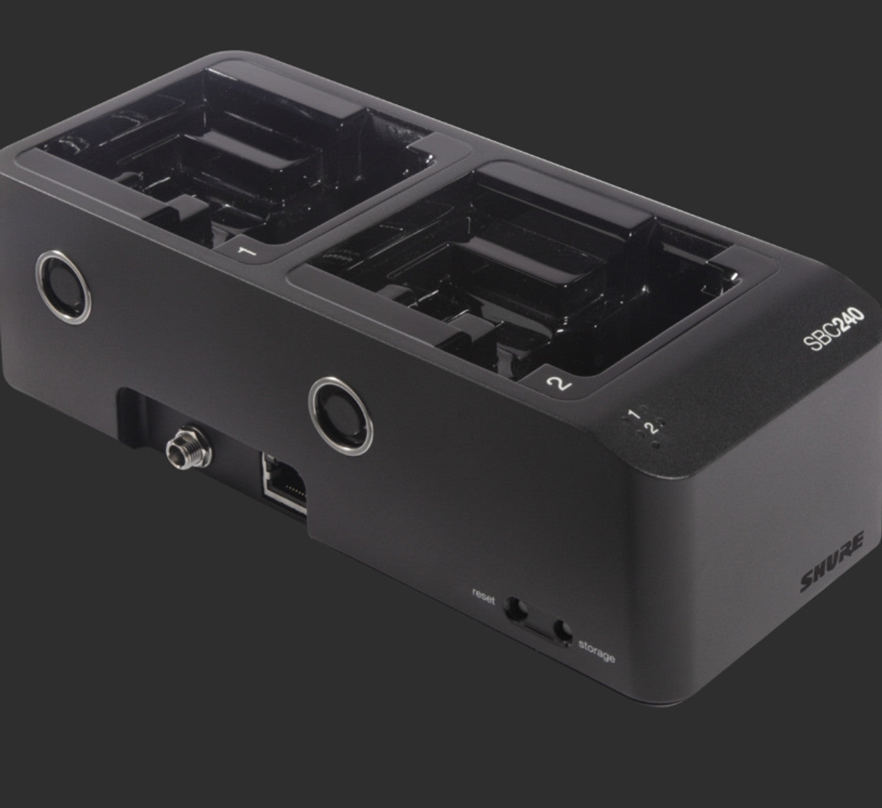 Caricabatterie per ADX1 e ADX2. Due slot di ricarica. Collegamento di rete per il monitoraggio dello stato di ricarica tramite software. Possibilità di collegamento in cascata di max 4 unità. Alimentatore non fornito.