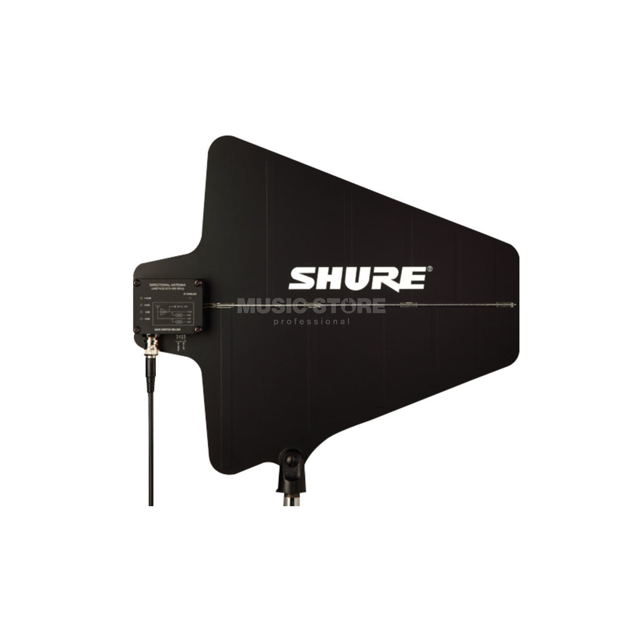 Antenna direttiva con amplificatore integrato. Frequenza di lavoro da 470 a 900Mhz. Diagramma polare cardioide, guadagno massimo +7,5 dBi. Guadagno dell'amplificatore selezionabile +12, +6, 0, -6 dB. Richiede alimentazione sul cavo d'antenna 10 - 15 Vdc, 75 mA. Dimensioni: 316 x 359 x 36 mm. Peso: 317 g. Accessori per installazione su asta e a parete inclusi.