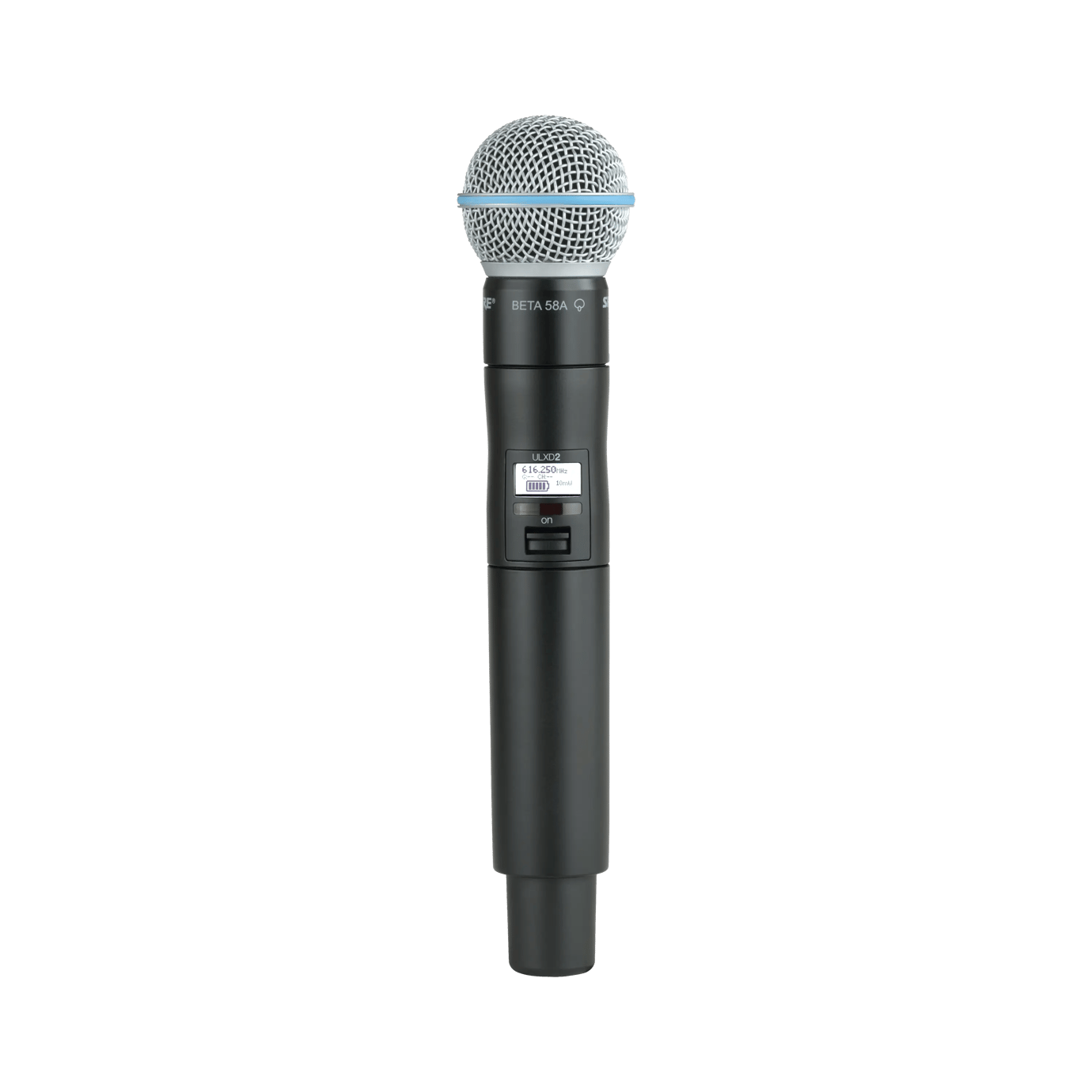 Trasmettitore digitale a mano dinamico supercardioide con capsula Beta 58 per serie ULX-D. Banda H51. Trasmissione digitale criptata (AES-256). Potenza di trasmissione selezionabile 1, 10, 20 mW. Fino a 72 sistemi per banda, ricerca automatica dei canali disponibili e sincronizzazione con il ricevitore tramite IR. Guadagno regolabile tra 0 - 21 dB (step 3 dB), SPL massimo 145 DB. Robusto chassis in alluminio, antenna elicoidale integrata. Porta IR per la sincronizzazione con il ricevitore, display LCD retroilluminato per impostazioni e monitoraggio dello stato. Alimentazione due batterie AA o batteria al litio ricaricabile Shure SB900, durata fino a 12 ore. Dimensioni: lunghezza 256 mm, diametro 51 mm. Peso: 340 g (senza batterie)