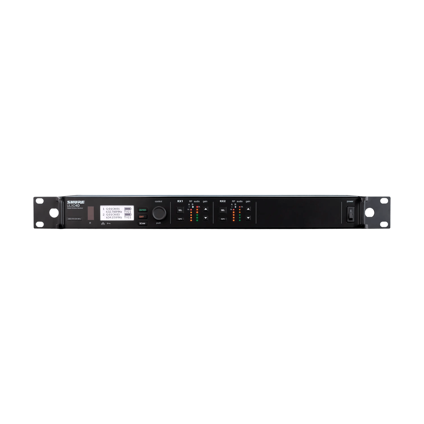 Ricevitore digitale a due canali per serie ULX-D in banda H51. Fino a 72 sistemi per banda, ricerca automatica dei canali disponibili e sincronizzazione del trasmettitore tramite IR. Display LCD per visualizzare lo stato del dispositivo e i parametri di configurazione. LED con indicazioni del livello di segnale RF e Audio. Pulsanti per impostazione del guadagno del sistema (range 60 dB). Uscita audio bilanciata XLR3 livello impostabile mic/line. Doppia porta di rete per controllo da remoto e interfaccia audio networking Dante. Possibilità di configurazione "Audio Summing" e "body-pack Frequency Diversity". Uscite RF per il collegamento di altri ricevitori. Alimentazione antenna 12-13 Vdc, max 150 mA. Alimentazione: 100-240 Vac, 0,26 A max. Dimensioni: 44 mm x 482 mm x 274 mm, 1 unità rack. Peso: 3,36 Kg.
