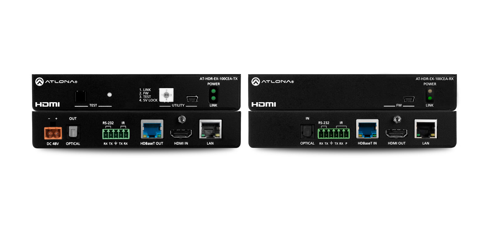 Kit extender HDMI a HDBT e viceversa formato da 1 Trasmettitore AT-HDR-EX-100CEA-TX 4K-UHD@60Hz 4:2:0 HDCP 2.2 con ingresso HDMI e 1 uscita HDbaseT Poe, supporto HDR10, 1 porta RS232, 1 porta IR, 1 uscita audio digitale ottica, 1 Porta MiniUSB per Firmware; 1 porta Ethernet di controllo con software AMS, Distanza max.100mt.,Alimentazione 230VAC-48VDC compresa, Dimensioni: 26x146x89mm., Peso 0,41Kg. e 1 Ricevitore AT-HDR-EX-100CEA-RX 4K-UHD@60Hz 4:2:0 HDCP 2.2 con ingresso HDbaseT Poe e 1 ingresso audio ottico e 1 uscita HDMI, supporto HDR10, 1 porta RS232, 1 porta IR, 1 uscita audio digitale ottica, 1 Porta MiniUSB per Firmware; 1 porta Ethernet di controllo con software AMS, Distanza max.100mt. Dimensioni: 26x146x89mm., Peso 0,41Kg