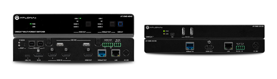 Kit composto da AT-OME-MS42 e ricevitore HDBaseT OME-EX-RX. AT-OME-MS42 viene alimentato tramite PoE dal ricevitore OME-EX-RX.
