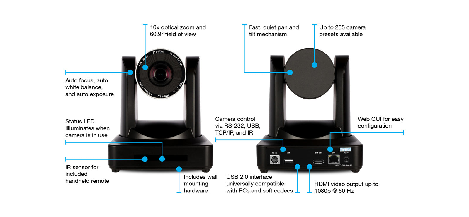 Telecamera PTZ con uscita HDMI Full-HD, colore nero, zoom 10X. Uscita HDMI con Risoluzione fino 1080p@60Hz. Porta USB 2.0 per videconferenza con risoluzione fino 1080p30. Campo visivo orizzontale 60.9°. Illuminazione minima 0.5 Lux@F 1.8. Funzionalità auto-Focus. Ottime prestazioni di ripresa anche con diverse condizioni di illuminazione. Supporto protocolli Visca, Pelco. Protocolli supportati RTSP/RTMP. 1 x Porta RS232. Porta LAN. Controllo via IR con telecomando incluso. Dimensioni 167,5x150x150mm, peso 1.4Kg. Alimentazione 12V (12W) con alimentatore incluso. Staffa per montaggio a parete inclusa