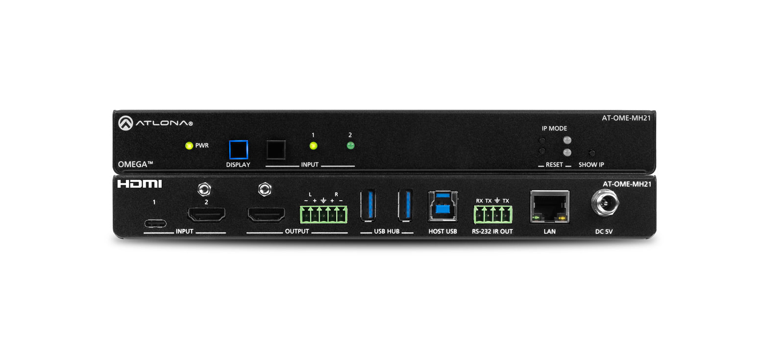 Switcher a due ingressi per HDMI e USB-C con hub USB ideale per huddle rooms, conference rooms di piccole dimensioni e video conferenza. HDMI per AV e USB-C per AV e dati, Hub USB 3.0 integrato. Supporto 4K/UHD a 60 Hz 4:4:4, HDR10, HLG e Dolby Vision @ 60Hz. Downscaling selezionabile da 4K a 1080p. Selezione automatica dell'ingresso e controllo automatico del display attraverso IP, RS232, IR, CEC. De-embedding dell'audio su connettore euroblock. La porta USB-C funziona anche da Host USB. Dotato di Interfaccia per PC host e periferiche USB, rendendolo ideale per le piattaforme di videoconferenza e UC (Unified Comunication) come Zoom, Skype for Business, Microsoft Teams, Cisco Webex, BlueJeans e GoToMeeting. Compatibile con la telecamera AT-HDVS-CAM e AT-HDVS-CAM-HDMI con l'interfaccia USB. Un input HDMI, un input USB-C, una porta USB tipo B (3.0), due porte USB tipo A (3.0), un output HDMI, un output audio stereo bilanciato, una porta RS232, una porta IR, una porta LAN per il controllo e la configurazione, una porta di alimentazione 5V. Peso: 0,975Kg. Dimensioni:26x219x152mm escluso alimentatore
