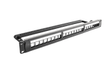 Pannello standard 19" in lamiera da 1.5 mm con 24 fori per prese Keystone, altezza 1 unità con barra fissa...