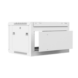 Rack 19" profondità 450 mm da 6 unità, dimensioni 600x450x368 mm (L, P, H ), porta frontale in vetro temperato con chiave, porta posteriore e laterali in acciaio rimovibili, montanti interni in acciaio da 1.5 mm frontali. Lamiera esterna da 1.2 mm con verniciato a polveri colore Bianco RAL 9003. Entrata cavi dal basso-alto e postere,griglia ventilazione nel coperchio. Massima profondità utilizzabile 410 mm. Conforme a standard ANSi/EIA RS-310D, DIN41491 e IEC60297. Portata fino a 60 Kg statici. Peso 18,5 Kg.