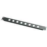 Pannello anteriore da 1U rack in alluminio da 2mm di spessore per installazione di n.8 connettori XLR femmina o maschio. Colore Nero RAL9005. Peso 0,14Kg