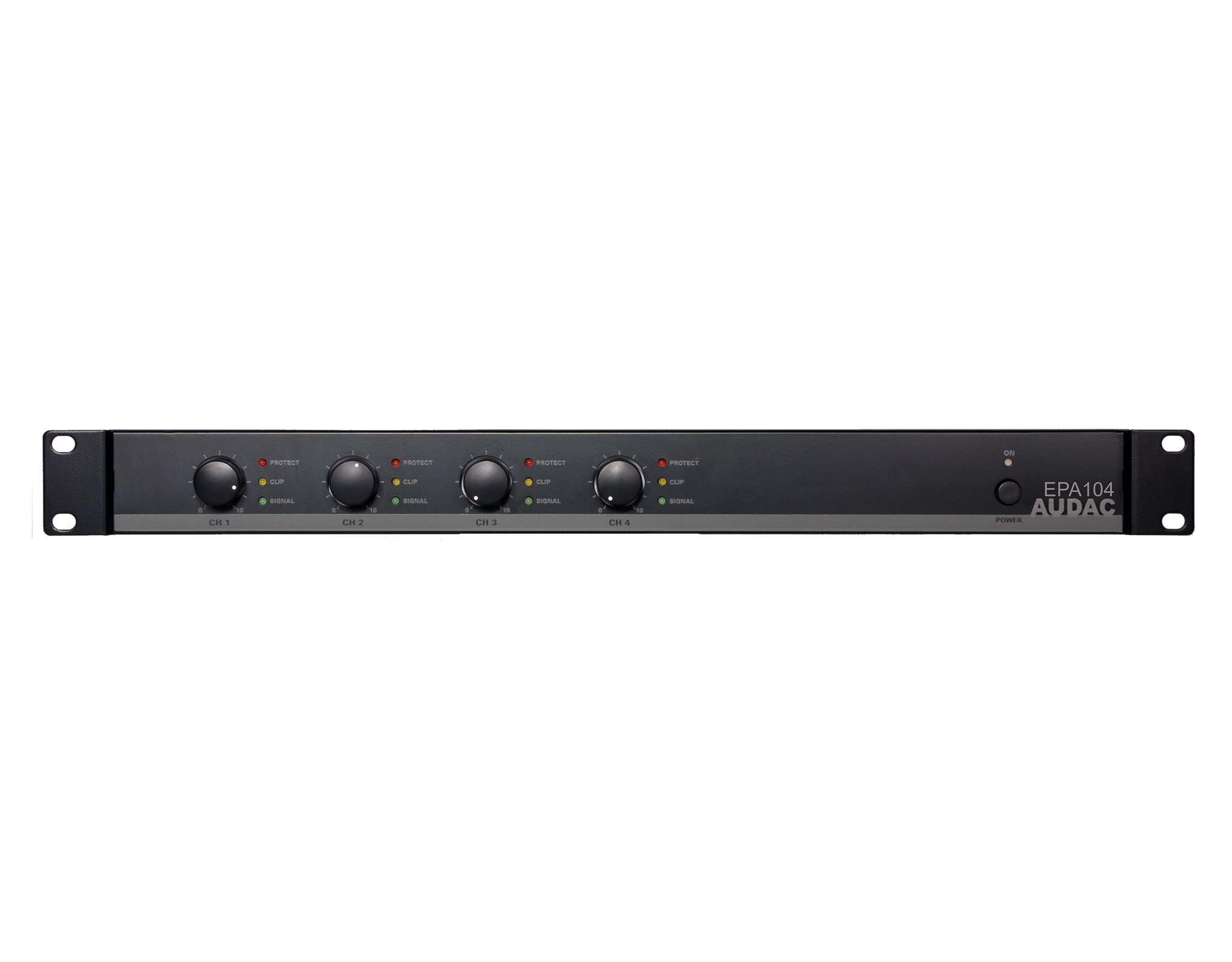 Amplificatore in classe D a 4 canali con regolazione frontale del volume da 4 x 100 W su 4 ohms, 4 x 50 W su 8 ohms, 2 x 200 W a ponte su 8 ohms. Ingressi audio bilanciati su XLR3. Connettori di uscita morsetti. Risposta in frequenza 20 Hz-20 Khz. Modalità di utilizzo dei canali stereo, a ponte o crossover( canali 1-2 full range, canali 3+4 a ponte subwoofer con filtro a 120 Hz). Protezione tensione DC in uscita, sovratemperatura e cortocircuito. Indicazioni di stato frontale. Tasto accensione frontale. Raffreddamento per convenzione. Tensione di alimentazione 100~240 V AC 50/60 Hz. Dimensioni 1 unità rack 482 x 44 x 330 mm. Peso 4,5 Kg.