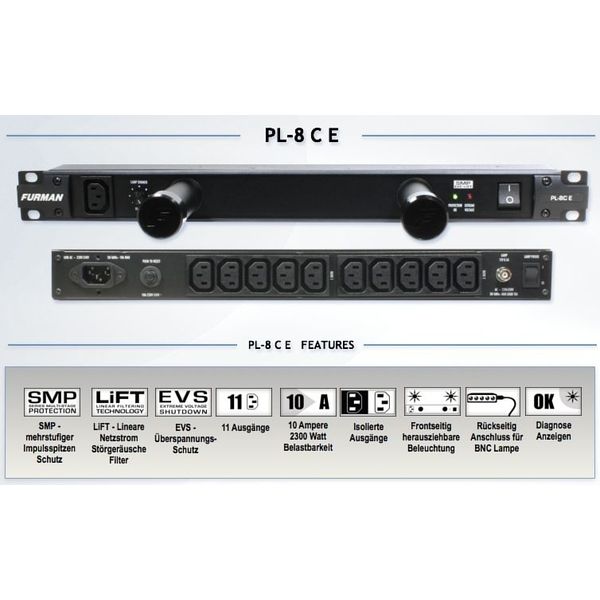 Distributore \ Condizionatore di rete 230VAC con 11 prese IEC di cui una frontale e 10 posteriori ( divise in due linee da 5, separate fra loro, antiinterferenze fra gruppi di apparecchi) in 1 unità rack; interruttore generale frontale; Led (verde)frontale di segnalazione protezione apparecchi inserita e Led (rosso) di segnalazione extravoltaggio; 2 tubi frontali retrattili di illuminazione a led del rack con regolazione di intensità; presa maschio entrata alim.posteriore; breacker 10A posteriore; connettore BNC posteriore per inserire lamp.illuminaz.post.del rack; include: Filtro brevettato anti RF ed interferenze elettromagnetiche ( LiFT ); Sistema di protezione brev.(SMP) dai picchi di tensione ( 330Volts ) / corrente ( 3.000Amp.); sistema di eliminazione dei picchi di tensione (E.V.S.); assenza assoluta di contaminazione verso massa; max.potenza in transito 10A a 230VAC, misure: 44x483x265mm, peso 5Kg, colore nero