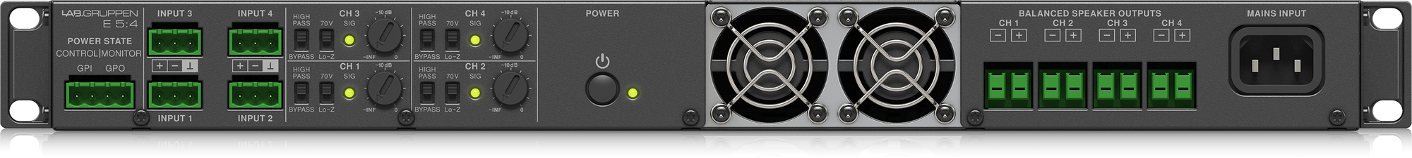 Amplificatore di potenza compatto in classe D proprietaria con tecnologia IDEEA (IntelliDrive Energy Efficient Amplifier) per la gestione intelligente della potenza sui due canali in funzione del carico. Potenza 4x125W su 4 ohm/70V, 125W su 8ohm. Ingressi bilanciati su connettori Phoenix e uscite altoparlanti su morsetti a vite. Regolazione del volume da trimmer posteriori. Porta GPIO per controllo e segnalazione stato accensione. Modalità di standby automatica in assenza di segnale e conformità alle specifiche di risparmio energetico Energy Star 3.0. Ventilazione forzata intelligente. Protezione da sovraccarico, sovratemperatura e corrente continua, protezione PAL (Power Average Limiter), protezione da sottotensione di alimentazione e sistema di protezione contro i transitori all'accensione. Indicatore frontale a LED presenza segnale e attivazione limiter. Filtro passa alto a 50Hz attivabile su ogni canale. Risposta in frequenza 2 Hz - 40 kHz, S/N>112 dBA @8ohm, THD<0.05%. 1 unità rack con frontale in alluminio dark grey e chassis in acciaio.Dimensioni W: 483 mm (19"), H: 44 mm (1 U),D: 276 mm (10.9"). Peso: 6 kg.