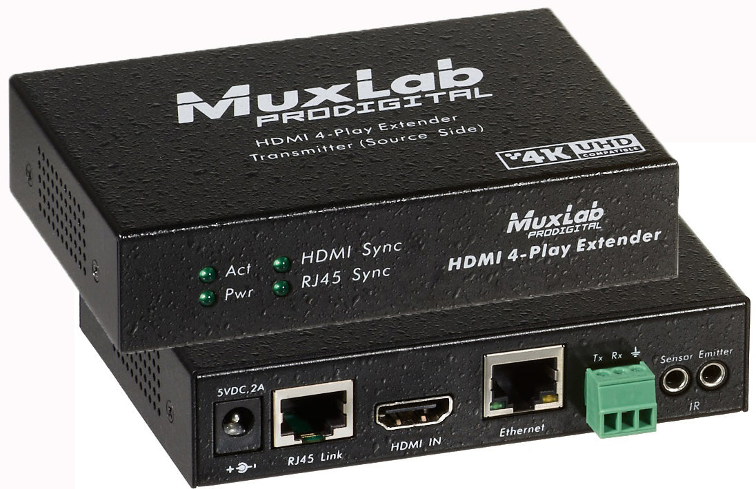 Kit di extender HDMI su HDbaseT, permette di estendere un segnale HDMI a tutte le risoluzioni fino a 4K, un segnale di controllo bidirezionale per sensori IR, un link Ethernet 10/100 Mbps e un flusso RS232, su Cat5e/6. Distanza massima: 70m con risoluzione 4K. HDMI 1.3a ma supporta le funzionalità 3D di HDMI 1.4. Connettori (entrambe le unità): 1 connettore HDMI, 1 Porta RJ45 Schermata per HDbaseT, 1 porta RJ45 schermata per estensione LAN, 2 minijack 3.5 per sensore/emettitore IR (compresi), 1 connettore Euroblock a 3 pin per RS232, 1 connettore alimentazione. 2 Alimentatori 110-240VAC/5VDC inclusi. Peso: 0.6 kg. Dimensioni: 11.2 x 7.6 x 2.5 cm