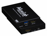 Bridge da HDMI a USB 3.0. Dispone di un ingresso HDMI, un'uscita USB 3.1 Gen 1(USB 3.0), un'uscita HDMI loop through. Ingresso audio su jack da 3.5mm per la connessione di un microfono. Uscita audio su jack da 3.5mm per cuffie o speaker attivi. L'audio del microfono viene mixato automaticamente con l'audio della sorgente HDMI. Supporta sorgenti fino a 4K@60fps. Risoluzione su uscita USB fino a 1080@60fps. Supporta il downscaling da 4K/60 a 1080/60. Esegue compressione H.264. Supporta UVC 1.0. Alimentatore 5V, 2A incluso. Compatibile con Windows 7/8.1/10, Linux OS e Mac OS. Dimensioni 103 x 71 x 16mm, peso tot. 380g.