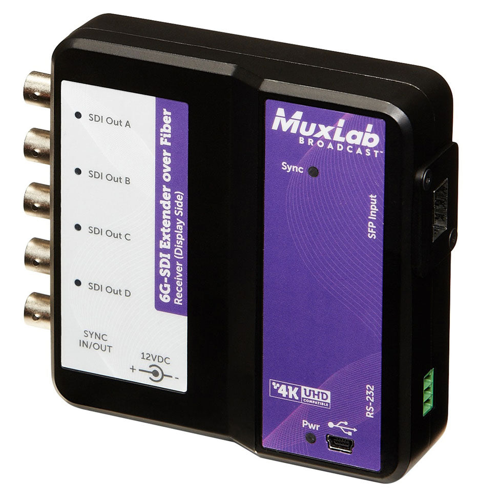 Kit extender 6G-SDI su fibra ottica multimodale. Permette di estendere un segnale SDI con risoluzione fino a 4K. Distanza massima 300m su F.O. OM3, 400m su F.O. OM4. Connettori TX: 4 BNC 75ohm per segnali video, 1 connettore BNC per SYNC, 1 porta SFP+ per interfaccia in fibra ottica, 1 porta mini USB per firmware update e diagnostica, 1 porta RS232, 1 connettore di alimentazione. Connettori RX: 4 connettori BNC 75ohm per segnali video, 1 connettore BNC per SYNC, 1 porta SFP+ per interfaccia in fibra ottica, 1 porta mini USB per firmware update e diagnostica, 1 porta RS232, 1 connettore di alimentazione. Alimentatori 110-240VAC/12Vdc inclusi. Dimensioni Tx e Rx: 110x110x32mm.