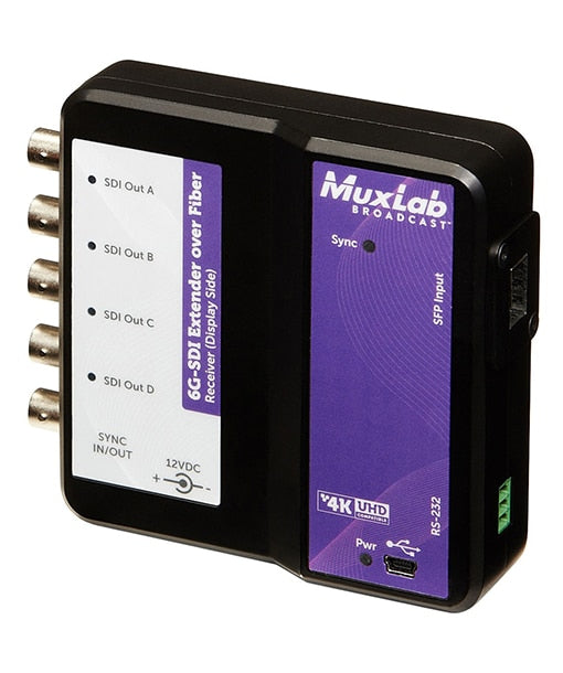 Kit extender 6G-SDI su fibra ottica monomodale. Permette di estendere un segnale SDI con risoluzione fino a 4K. Distanza massima 10Km. Connettori TX: 4 BNC 75ohm per segnali video, 1 connettore BNC per SYNC, 1 porta SFP+ per interfaccia in fibra ottica, 1 porta mini USB per firmware update e diagnostica, 1 porta RS232, 1 connettore di alimentazione. Connettori RX: 4 connettori BNC 75ohm per segnali video, 1 connettore BNC per SYNC, 1 porta SFP+ per interfaccia in fibra ottica, 1 porta mini USB per firmware update e diagnostica, 1 porta RS232, 1 connettore di alimentazione. Alimentatori 110-240VAC/12Vdc inclusi. Dimensioni Tx e Rx: 110x110x32mm.