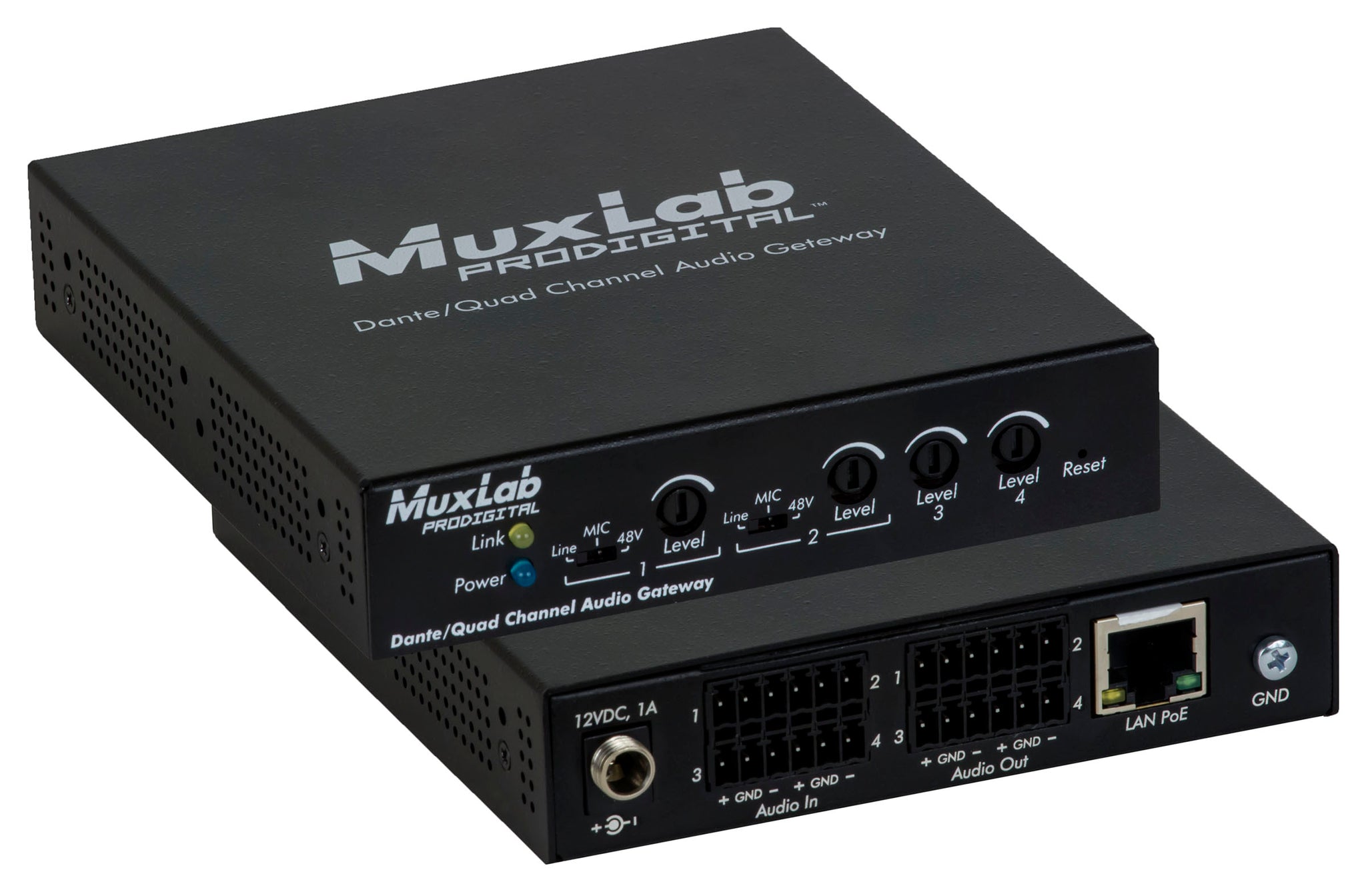 Interfaccia analogica per il collegamento di device audio tramite protocollo Dante. Supporta la trasmissione di 2 coppie stereo oppure di 4 canali singoli con segnale bilanciato da 20Hz a 20KHz, coprendo distanze fino a 100m tramite cavo Cat5e/6. Fornisce 4 in/out analogici bilanciati da e verso apparecchiature che offrono connettività Dante. In e out bilanciati possono trasportare anche segnali sbilanciati utilizzando solamente 2 pin su 3 per canale. Sono inoltre presenti: controllo remoto tramite web browser, compatibilità con il software Audinate Dante Controller e alimentazione PoE. Dimensioni: 111 x 120 x 25mm