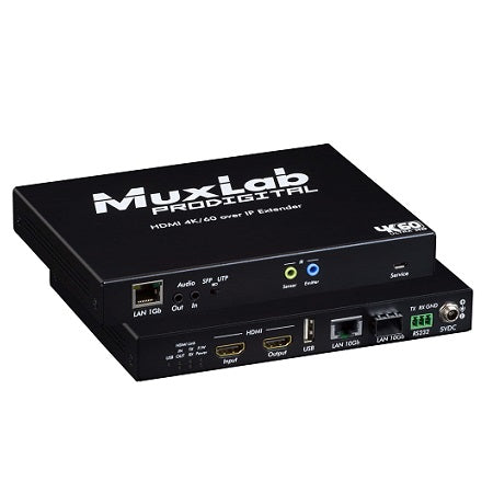 Transceiver HDMI-USB Over IP, permette di estendere fino a 100m un segnale HDMI 4K60Hz (4:2:0) non compresso e USB attraverso rete Ethernet 10Gb su cavo CAT6A/7. Il singolo Transceiver può essere usato come trasmettitore o come ricevitore. Nessuna compressione(zero latenza) fino 4K/60 (4:2:0). Leggera compressione per 4K/60 (4:4:4) con latenza inferiore al frame. Banda: fino 10 Gbps. USB 1.1 per mouse/tastiera. Gestibile con Muxlab Network Controller 500812. Permette di estendere anche RS232 e IR. Connettori: 1 ingresso HDMI 2.0, 1 uscita HDMI 2.0, 1 porta Ethernet RJ45 10Gb, 1 porta Ethernet RJ45 1Gb, 2 minijack 3.5mm per estrazione o inserzione audio, 1 porta USB type A (per connessione dell'USB host o delle periferiche), connettore di alimentazione, connettore terminal-block RS232, porta minijack 3.5mm per IR Sensor, porta minijack 3.5mm per IR Emitter, Porta SFP non popolata per modulo SFP+ 10Gb (non incluso). Peso: 0.62kg. Dimensioni: 210mm x 132mm x 24mm