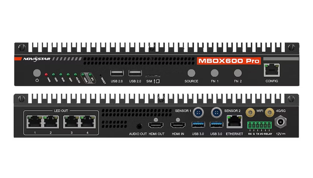 Novastar Industrial Controller – Unità di controllo e programmazione schermo all in one dotata di porte RJ45 per il controllo dello schermo, capacità 2.6 milioni di pixel, risoluzione max 4096x1920px, Sistema Operativo Windows 10&11 IoT Enterprise, WiFi 5, Intel Processor N97, input: 1x HDMI 1.3, 2xUSB2.0, 2xUSB3.0, output: 4xRJ45, 1xHDMI1.3, 1x3,5mm Audio. Controllo del dispositivo tramite 2x Gigabit Ethernet Port, 1xRS232, 2x Sensor port. Supporta Free Scaling e protocollo di monitoraggio SNMP