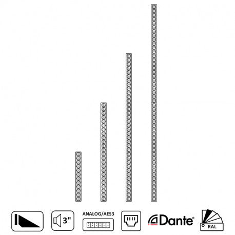 Diffusore ad array con DSP interno a controllo elettronico della direttività mediante algoritmi U.R.G.O.; n.48 woofer da 3" ciascuno con proprio canale di amplificazione da 40WRMS e DSP; dispersione orizzontale 120°; dispersione verticale regolabile da 10° a 30° per ciascun lobo, gestione fino ad un massimo di 24 lobi; Azimuth regolabile elettronicamente +/-30°; Steering a partire da 200 Hz, Controllo della direttività a partire da 100Hz; Risposta in frequenza: 135-17kHz; Max SPL 97dB (a 30 metri), ingresso analogico bilanciato e digitale AES\EBU o DANTE; doppia porta RJ-45 per connessione ethernet in Daisy-chain; contatti di fault per il monitoraggio dello stato del diffusore con possibilità di impostare il tono pilota per la verifica della presenza della sorgente; Misure: H=3997 mm, L=111mm, P=121mm; staffa ruotabile da muro compresa; Peso: 48 Kg; colore bianco.