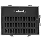 Valigia di ricarica e contenimento fino a 36 unità bodypack, trasmettitori/ricevitori. Due dei 28 slot di ricarica compatibili con trasmettitore...